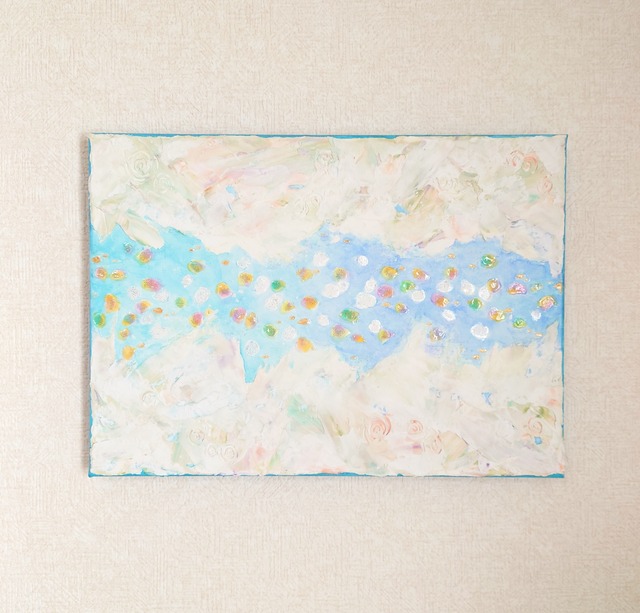 すべてのものが 目覚めていく この時に 私たちは生まれた 変わる時に合わせて 私たちは生まれた 制作はアクリル絵の具で描いた後、メディウム等で少し手の込んだ工程を施し、また彩色いたしました。 画像ではわかりにくいですが、中心から外側に向けて描いた白い光の部分は、パールホワイトやゴールドを使用し、メタリックな輝きを放っています。 仕上げには画面保護用ワニス(つやあり)をスプレーしております。 側面はメタリックなライトブルーで塗っておりますので、額装無しでも飾って頂けます。 サイズ F6 縦41.0cm×横31.8cm×幅1.5cm 壁にピンで掛けて頂けます。 ご希望がございましたら、壁掛け紐を取り付けさせて頂きます。 もちろん置く形でも飾って頂けます。 尚、ハンドメイドのため色ムラや小傷がある場合がございますが、お気になさらない方にお譲りさせて頂きたいと思います。 売上金の一部は犬猫殺処分ゼロ活動をされている団体へ寄付をさせて頂きます。 ご検討等のほど何とぞよろしくお願い申し上げます。